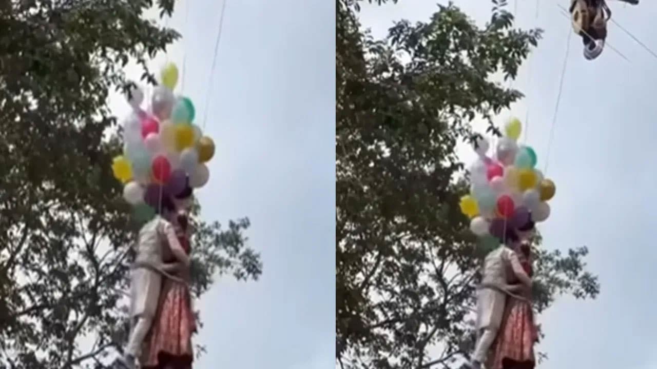 ఆ వీడియోలో వధూవరులు గాల్లో వేలాడుతూ పోజులు ఇస్తున్నారు. ఇద్దరూ సాంప్రదాయ దుస్తులు ధరించి, వాటికి రంగురంగుల బెలూన్ల గుత్తిని కట్టుకున్నారు. మొదట చూస్తే బెలూన్ల సాయంతో గాల్లో తేలుతున్నట్లే అనిపిస్తుంది. కానీ వాస్తవానికి, వారు ఒక పెద్ద క్రేన్కు వేలాడదీయబడ్డారు.