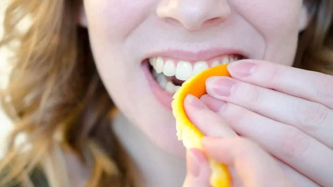 ఆ తొక్కలోని తెల్లటి భాగాన్ని దంతాలపై మృదువుగా రుద్దండి.